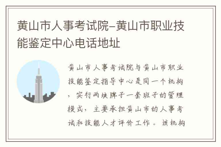黄山市人事考试院与黄山市职业技能鉴定指导中心是同一个机构,实行两块牌子一套班子的管理模式,主要承担黄山市的人事考试和技能人才评价工作 。