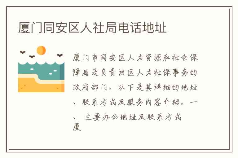 厦门市同安区人力资源和社会保障局是负责该区人力社保事务的政府部门,以下是其详细的地址、联系方式及服务内容介绍。
