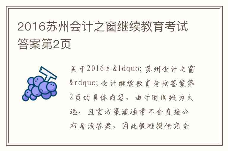 关于2016年“苏州会计之窗”会计继续教育考试答案第2页的具体内容,由于时间较为久远,且官方渠道通常不会直接公布考试答案,因此很难提供完全准确的官方第2页原题。不过,根据网络上留存的资料,可以为您整理出当时考试中可能出现的试题类型和内容,这些内容大致反映了当时考试第2页可能涵盖的知识点。