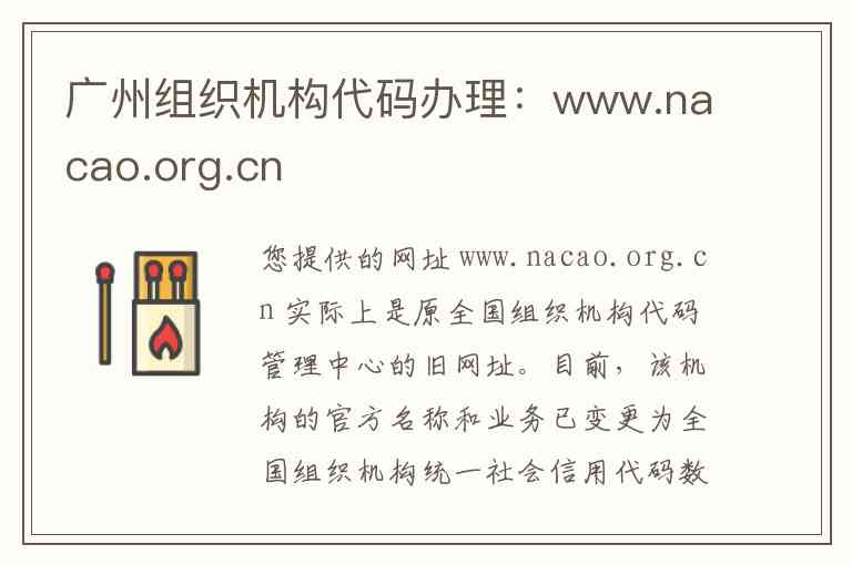 您提供的网址 www.nacao.org.cn 实际上是原全国组织机构代码管理中心的旧网址。目前,该机构的官方名称和业务已变更为全国组织机构统一社会信用代码数据服务中心,其核心业务与服务主要通过新官网 www.cods.org.cn 开展 。