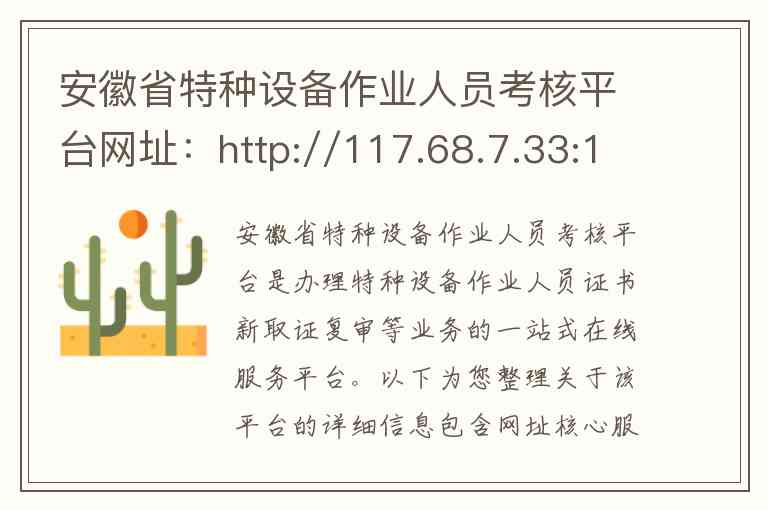 安徽省特种设备作业人员考核平台是办理特种设备作业人员证书新取证复审等业务的一站式在线服务平台。以下为您整理关于该平台的详细信息包含网址核心服务操作流程及各地市联系方式