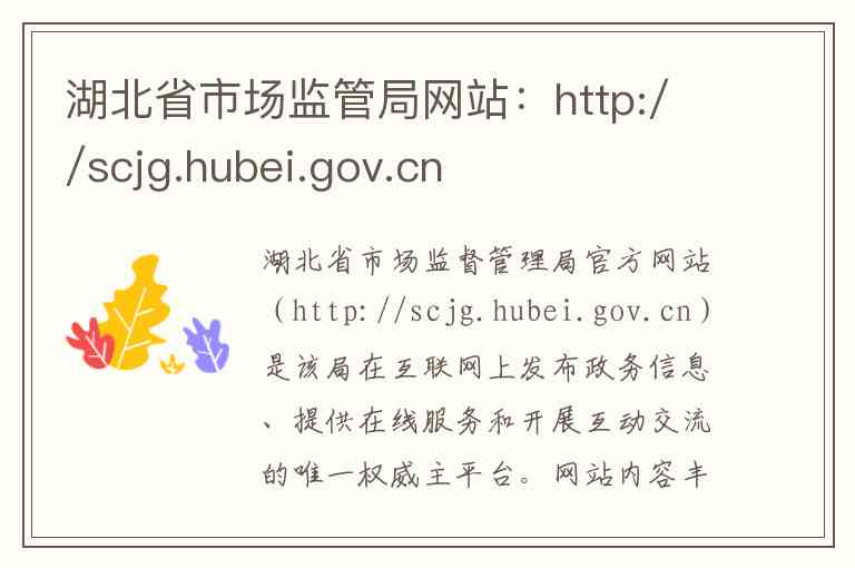 湖北省市场监督管理局官方网站(http://scjg.hubei.gov.cn)是该局在互联网上发布政务信息、提供在线服务和开展互动交流的唯一权威主平台。网站内容丰富,功能明确,旨在为公众、企业和投资者提供透明的市场监管信息和便捷的政务服务。