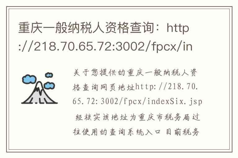 关于您提供的重庆一般纳税人资格查询网页地址http://218.70.65.72:3002/fpcx/indexSix.jsp 经核实该地址为重庆市税务局过往使用的查询系统入口 目前税务服务已统一整合至 newer 平台 以下为您梳理当前重庆市一般纳税人资格查询的官方服务渠道及相关信息
