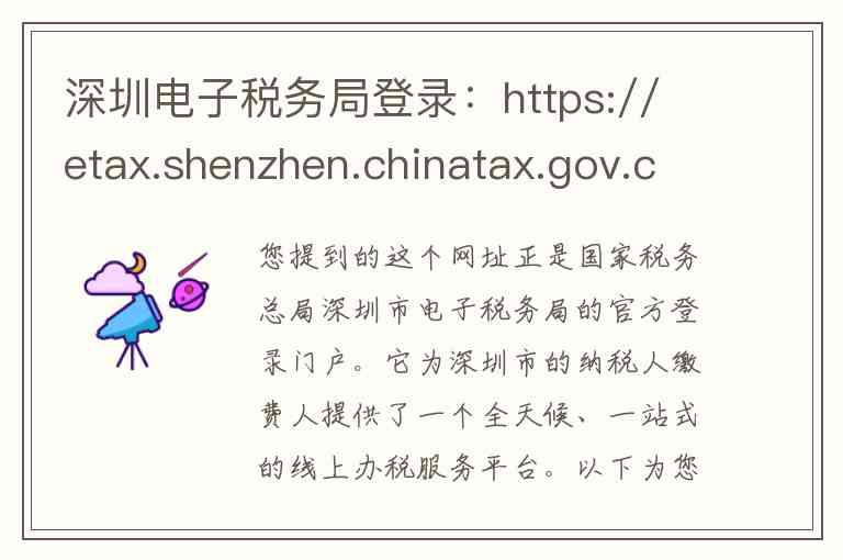 您提到的这个网址正是国家税务总局深圳市电子税务局的官方登录门户。它为深圳市的纳税人缴费人提供了一个全天候、一站式的线上办税服务平台。以下为您详细介绍其核心内容、服务功能以及官方联系方式。