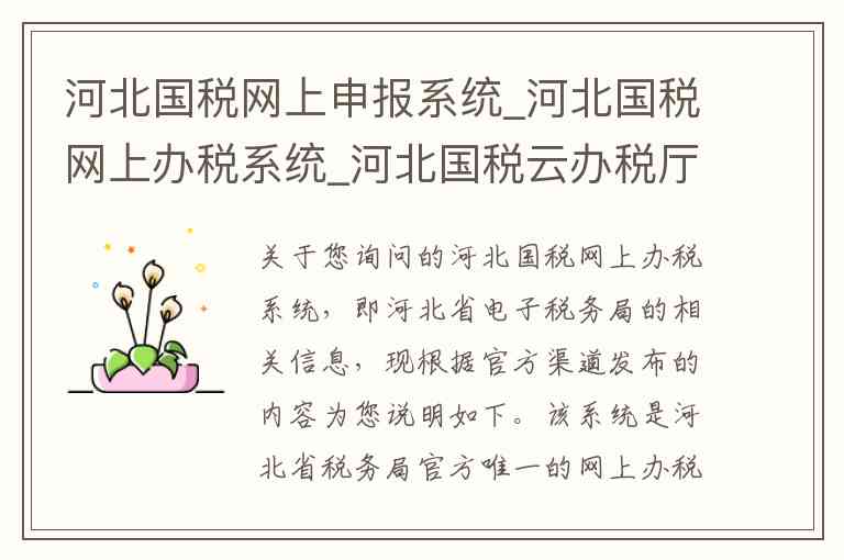 关于您询问的河北国税网上办税系统,即河北省电子税务局的相关信息,现根据官方渠道发布的内容为您说明如下。该系统是河北省税务局官方唯一的网上办税平台,整合了原国税、地税业务,为纳税人提供“一站式”在线服务。