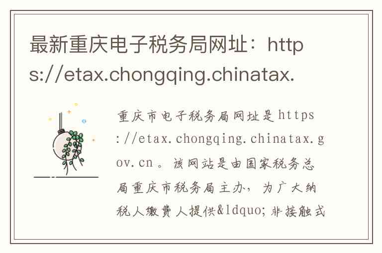 重庆市电子税务局网址是 https://etax.chongqing.chinatax.gov.cn 。该网站是由国家税务总局重庆市税务局主办,为广大纳税人缴费人提供“非接触式”办税缴费服务的官方线上平台 。以下为您详细介绍其服务内容、地址及联系方式。