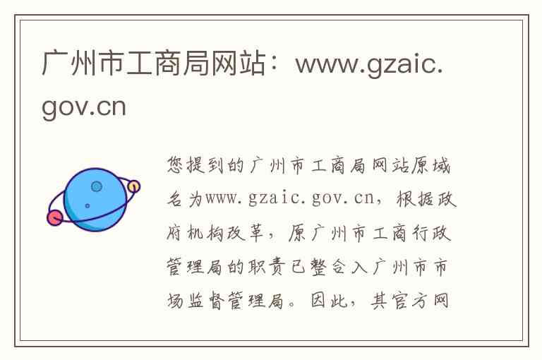 您提到的广州市工商局网站原域名为www.gzaic.gov.cn,根据政府机构改革,原广州市工商行政管理局的职责已整合入广州市市场监督管理局。因此,其官方网站现已变更为广州市市场监督管理局(知识产权局)网站,新网址为 http://scjgj.gz.gov.cn/ 。该网站是广州市市场监督管理局的官方门户,面向社会公众、企业和投资者提供全面的政府信息与在线服务。