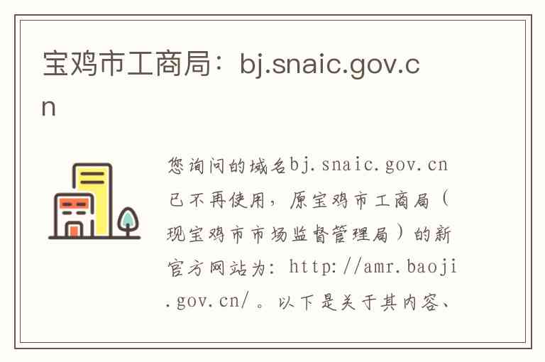 您询问的域名bj.snaic.gov.cn 已不再使用,原宝鸡市工商局(现宝鸡市市场监督管理局)的新官方网站为:http://amr.baoji.gov.cn/ 。以下是关于其内容、服务及联系方式的详细介绍。