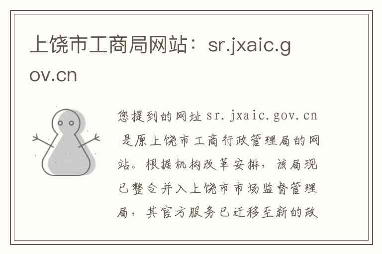 您提到的网址 sr.jxaic.gov.cn 是原上饶市工商行政管理局的网站。根据机构改革安排,该局现已整合并入上饶市市场监督管理局,其官方服务已迁移至新的政务平台。以下是关于其当前职能、服务内容及联系方式的详细说明。