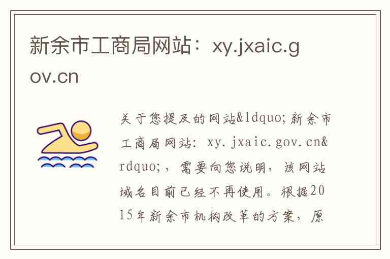 关于您提及的网站“新余市工商局网站:xy.jxaic.gov.cn”,需要向您说明,该网站域名目前已经不再使用。根据2015年新余市机构改革的方案,原新余市工商行政管理局、新余市质量技术监督局、新余市食品药品监督管理局已经整合,组建为新余市市场监督管理局 。因此,原工商局的相关职能和业务现已统一由新余市市场监督管理局承担。