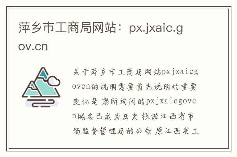 需要首先说明的重要变化是 您所询问的pxjxaicgovcn域名已成为历史 根据江西省市场监督管理局的公告 原江西省工商局网站使用的域名wsdjjxaicgovcn已于近年停止使用 新的统一入口为framrjxigovcn 同时 原萍乡市工商局因机构改革 已整合组建为萍乡市市场监督管理局 其官方网站域名也变更为scjdpingxianggovcn 因此 访问新网站是获取萍乡市工商相关业务信息和服务的主要途径