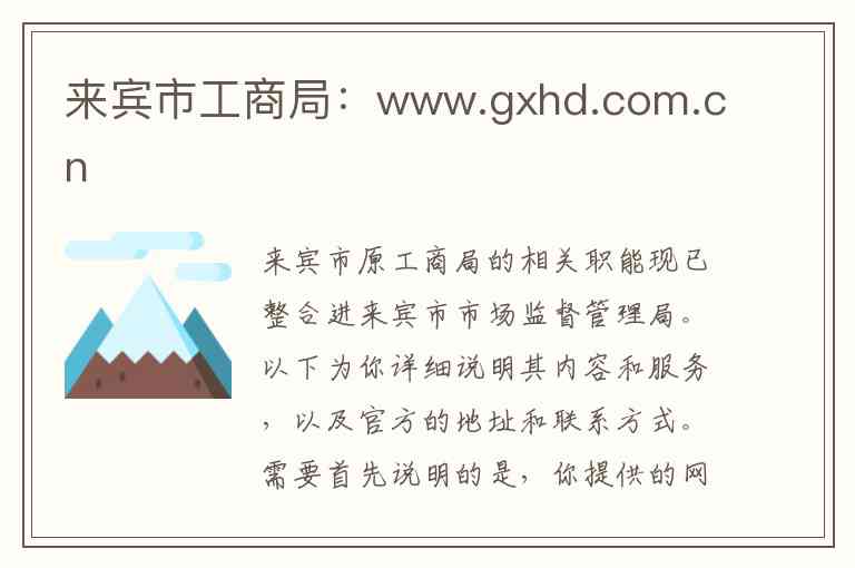 需要首先说明的是,你提供的网址www.gxhd.com.cn并非来宾市市场监督管理局的官方网站。该局的官方政务网站域名为http://scjdglj.laibin.gov.cn/,通常通过来宾市人民政府官网(http://www.laibin.gov.cn)进入。