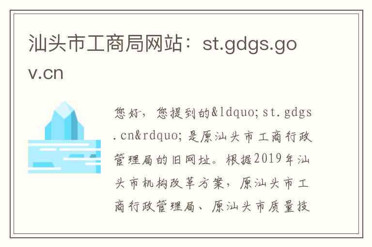 您好,您提到的“st.gdgs.cn”是原汕头市工商行政管理局的旧网址。根据2019年汕头市机构改革方案,原汕头市工商行政管理局、原汕头市质量技术监督局、原汕头市食品药品监督管理局等部门的职责已整合,组建了“汕头市市场监督管理局”。因此,原工商局网站已停止更新,其职能和内容已由新部门承接。您需要访问的是汕头市市场监督管理局的官方网站。