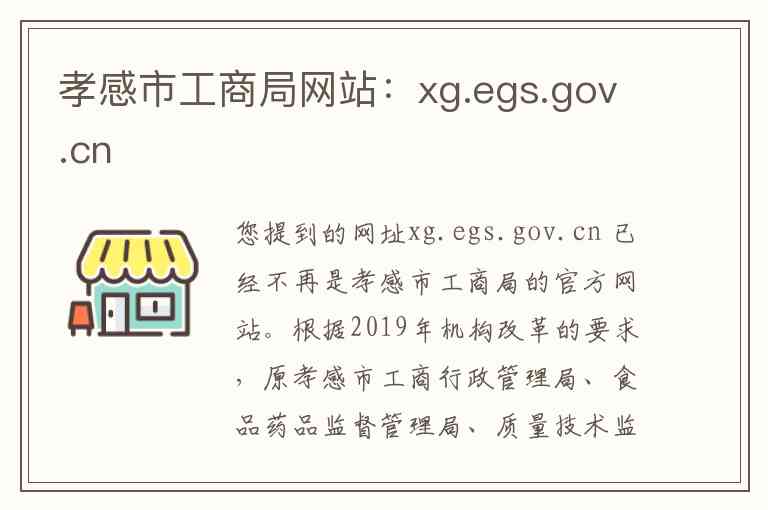 您提到的网址xg.egs.gov.cn 已经不再是孝感市工商局的官方网站。根据2019年机构改革的要求,原孝感市工商行政管理局、食品药品监督管理局、质量技术监督局等部门的职能进行了整合,组建了孝感市市场监督管理局,并统一使用新的政府域名 。
