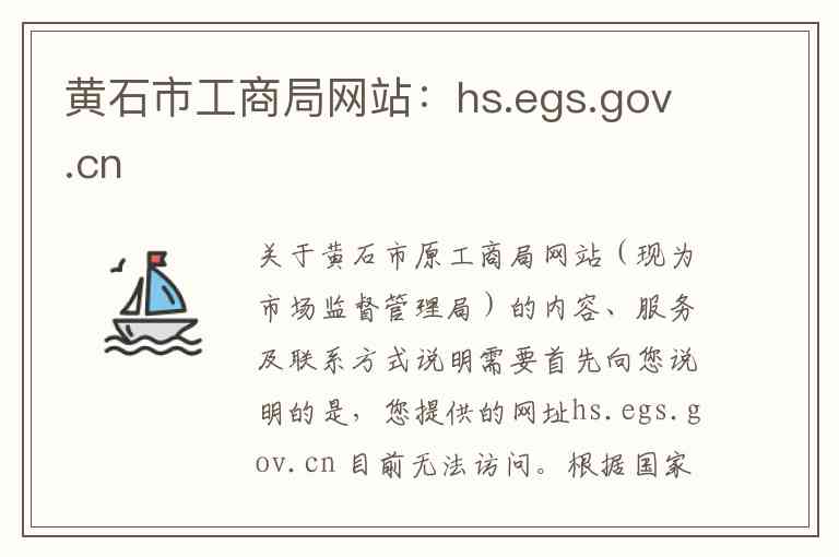 需要首先向您说明的是,您提供的网址hs.egs.gov.cn 目前无法访问。根据国家机构改革方案,原黄石市工商行政管理局的职能已整合并入新成立的黄石市市场监督管理局。因此,原工商局的相关业务和服务现在均由黄石市市场监督管理局承接,其官方门户网站也已变更为:http://scjg.huangshi.gov.cn/ 。以下是关于该新网站的详细内容、服务及联系信息。