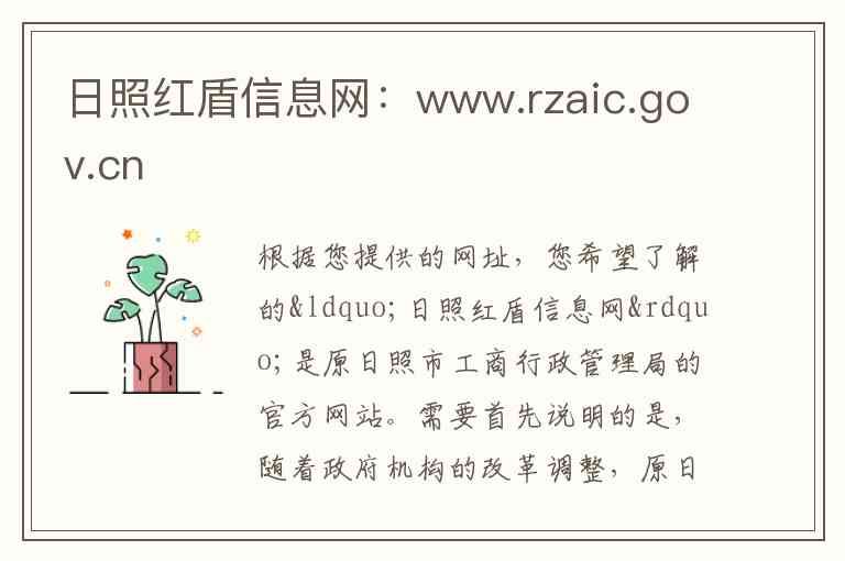 根据您提供的网址,您希望了解的“日照红盾信息网”是原日照市工商行政管理局的官方网站。需要首先说明的是,随着政府机构的改革调整,原日照市工商行政管理局的职能已整合并入日照市市场监督管理局,其官方网站的域名也已更新。因此,您提供的网址www.rzaic.gov.cn 很可能已经不再作为主站使用,新的官方信息发布渠道是“日照市市场监督管理局”的网站,域名为 amr.rizhao.gov.cn 。