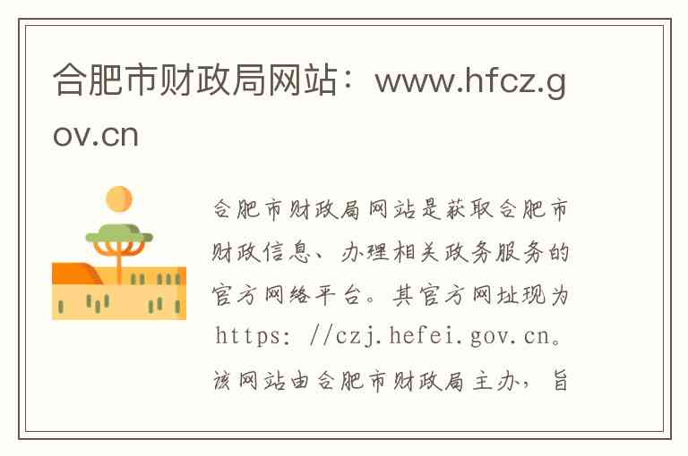 合肥市财政局网站是获取合肥市财政信息、办理相关政务服务的官方网络平台。其官方网址现为 https://czj.hefei.gov.cn。该网站由合肥市财政局主办,旨在提供信息公开、在线办事和互动交流等服务。