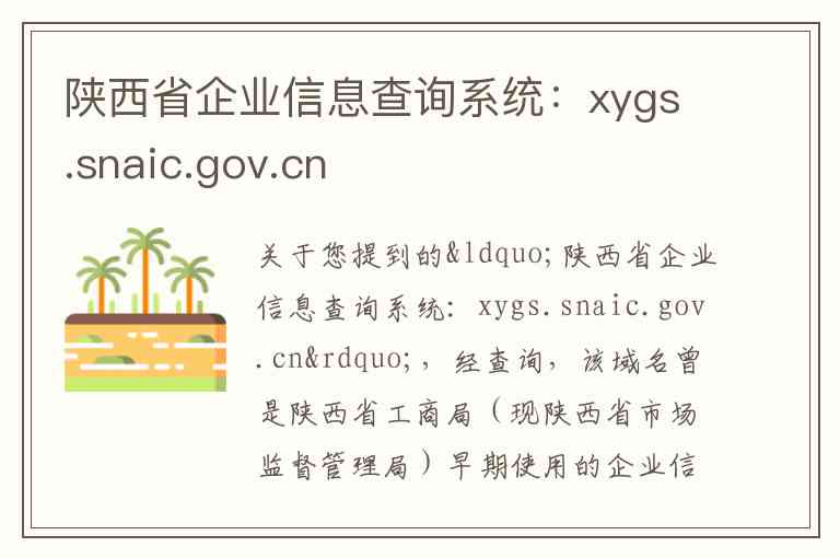 关于您提到的“陕西省企业信息查询系统:xygs.snaic.gov.cn”,经查询,该域名曾是陕西省工商局(现陕西省市场监督管理局)早期使用的企业信用信息公示系统。但目前,该系统已不再使用,其功能已整合至新的官方平台。现为您提供当前陕西省企业信息查询的官方渠道及相关服务信息如下: