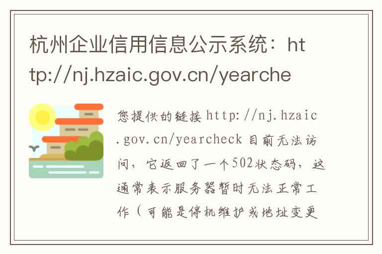 您提供的链接 http://nj.hzaic.gov.cn/yearcheck 目前无法访问,它返回了一个502状态码,这通常表示服务器暂时无法正常工作(可能是停机维护或地址变更)。根据最新的官方信息,杭州市的企业信用信息公示服务已经统一迁移至国家级的平台。以下为您详细说明目前官方指定的内容、服务、以及联系方式。