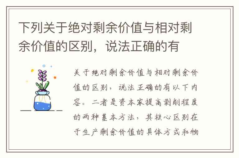 关于绝对剩余价值与相对剩余价值的区别,说法正确的有以下内容。二者是资本家提高剥削程度的两种基本方法,其核心区别在于生产剩余价值的具体方式和物质技术基础不同。以下将结合相关理论资料,对它们的区别进行详细说明。