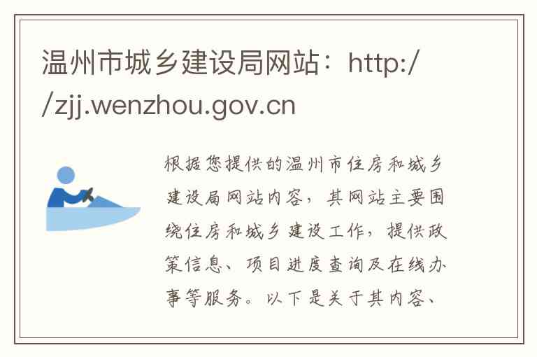 根据您提供的温州市住房和城乡建设局网站内容,其网站主要围绕住房和城乡建设工作,提供政策信息、项目进度查询及在线办事等服务。以下是关于其内容、服务及联系方式的详细说明: