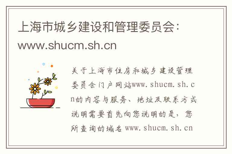 需要首先向您说明的是,您所查询的域名 www.shucm.sh.cn 是原“上海市城乡建设和管理委员会”使用的门户网站地址。根据2015年上海市政府机构改革,原“上海市城乡建设和管理委员会”与“上海市住房保障和房屋管理局”的相关职责已进行整合,组建了新的“上海市住房和城乡建设管理委员会”。因此,原域名目前已停用或跳转,新机构的官方门户网站域名为 zjw.sh.gov.cn 。