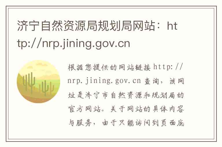 根据您提供的网站链接 http://nrp.jining.gov.cn 查询,该网址是济宁市自然资源和规划局的官方网站。关于网站的具体内容与服务,由于只能访问到页面底部的版权与联系方式信息,无法全面浏览网站内页,因此以下信息主要基于该页面的确定性内容以及对该类政府网站的一般功能进行说明。