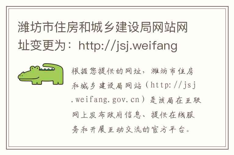 根据您提供的网址,潍坊市住房和城乡建设局网站(http://jsj.weifang.gov.cn)是该局在互联网上发布政府信息、提供在线服务和开展互动交流的官方平台。以下将详细介绍该网站的主要功能与服务,并提供官方的联系方式和地址。