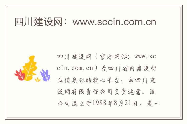 四川建设网(官方网站:www.sccin.com.cn)是四川省内建设行业信息化的核心平台,由四川建设网有限责任公司负责运营。该公司成立于1998年8月21日,是一家专注于信息系统集成、电子招标系统开发和运营的高新技术企业 。