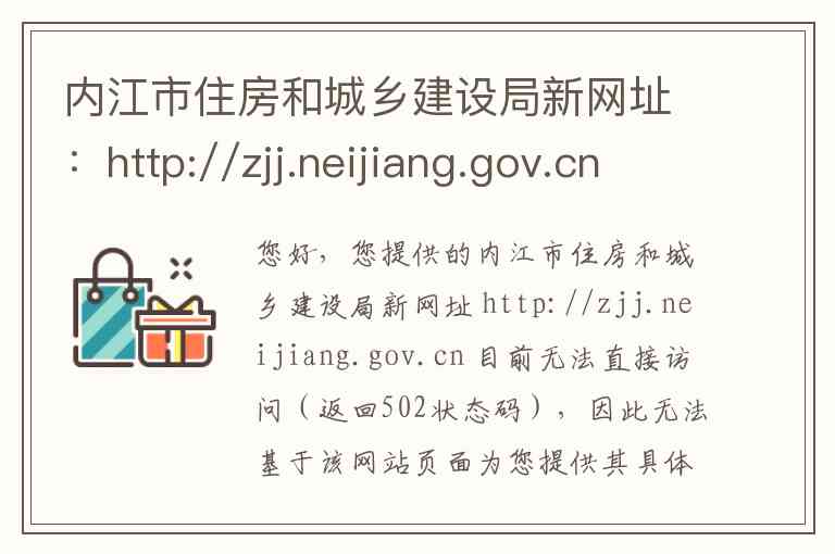 您好,您提供的内江市住房和城乡建设局新网址 http://zjj.neijiang.gov.cn 目前无法直接访问(返回502状态码),因此无法基于该网站页面为您提供其具体内容介绍。不过,根据从内江市人民政府官网及其他公开渠道获取的权威信息,我为您整理了该局的核心职能、服务内容、办公地址及联系方式,供您参考。