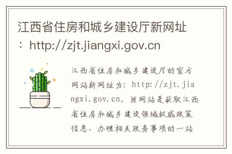 江西省住房和城乡建设厅的官方网站新网址为:http://zjt.jiangxi.gov.cn。该网站是获取江西省住房和城乡建设领域权威政策信息、办理相关政务事项的一站式平台。以下为您详细介绍其核心内容与服务,并整理关键的地址和联系方式。