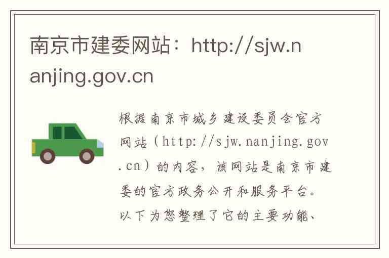根据南京市城乡建设委员会官方网站(http://sjw.nanjing.gov.cn)的内容,该网站是南京市建委的官方政务公开和服务平台。以下为您整理了它的主要功能、内容以及联系信息。