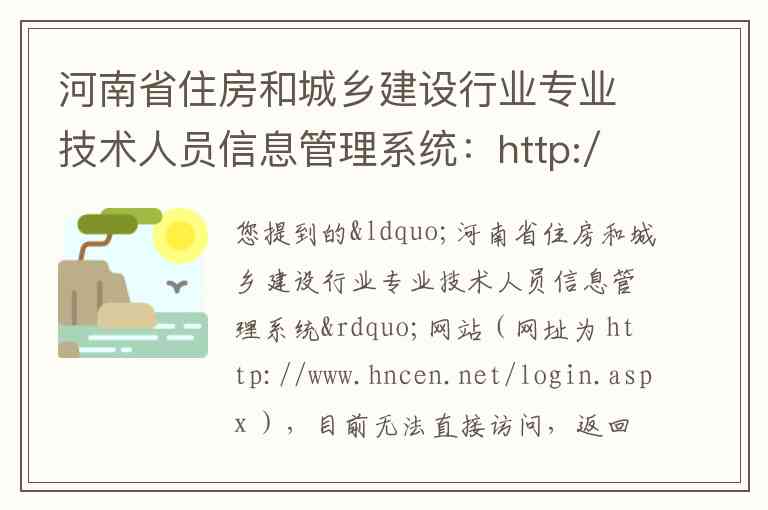 您提到的“河南省住房和城乡建设行业专业技术人员信息管理系统”网站(网址为 http://www.hncen.net/login.aspx ),目前无法直接访问,返回了“403”禁止访问的状态。这意味着该登录页面可能因系统维护、地址变更或网络限制等原因暂时无法打开。