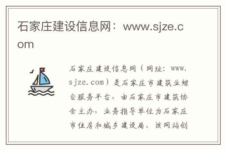 石家庄建设信息网(网址:www.sjze.com)是石家庄市建筑业综合服务平台,由石家庄市建筑协会主办,业务指导单位为石家庄市住房和城乡建设局。该网站创建于2002年12月5日,域名年龄较长,是石家庄地区建设领域的重要信息窗口。