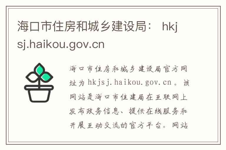海口市住房和城乡建设局官方网址为 hkjsj.haikou.gov.cn 。该网站是海口市住建局在互联网上发布政务信息、提供在线服务和开展互动交流的官方平台。