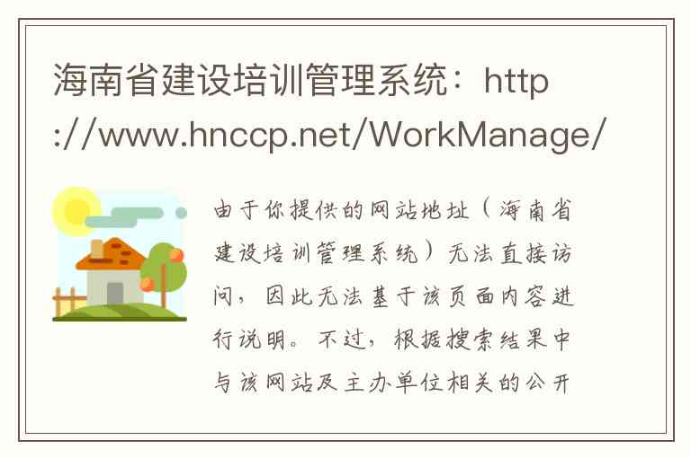 由于你提供的网站地址(海南省建设培训管理系统)无法直接访问,因此无法基于该页面内容进行说明。不过,根据搜索结果中与该网站及主办单位相关的公开信息,可以为你详细介绍其背景、服务内容及联系方式。
