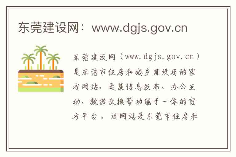 东莞建设网(www.dgjs.gov.cn)是东莞市住房和城乡建设局的官方网站,是集信息发布、办公互动、数据交换等功能于一体的官方平台 。该网站是东莞市住房和城乡建设局实现政务公开、打造服务型政府的重要载体 。