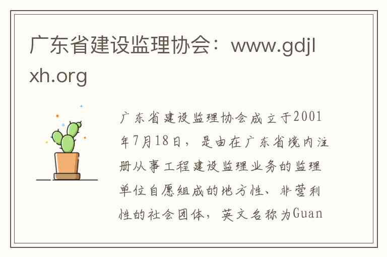 广东省建设监理协会成立于2001年7月18日,是由在广东省境内注册从事工程建设监理业务的监理单位自愿组成的地方性、非营利性的社会团体,英文名称为Guangdong Province Association of Engineering Consultants,缩写为GPAEC 。协会登记管理机关为广东省民政厅,并接受广东省住房和城乡建设厅等相关政府职能部门的业务指导 。其信用代码为514400007287591914 。