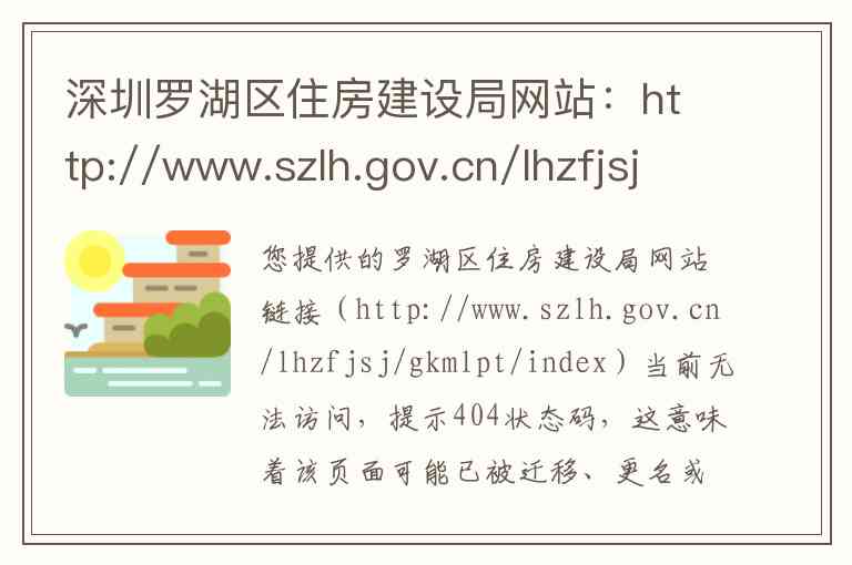 您提供的罗湖区住房建设局网站链接(http://www.szlh.gov.cn/lhzfjsj/gkmlpt/index)当前无法访问,提示404状态码,这意味着该页面可能已被迁移、更名或移除。