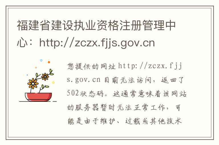 您提供的网址 http://zczx.fjjs.gov.cn 目前无法访问,返回了502状态码。这通常意味着该网站的服务器暂时无法正常工作,可能是由于维护、过载或其他技术问题导致的。