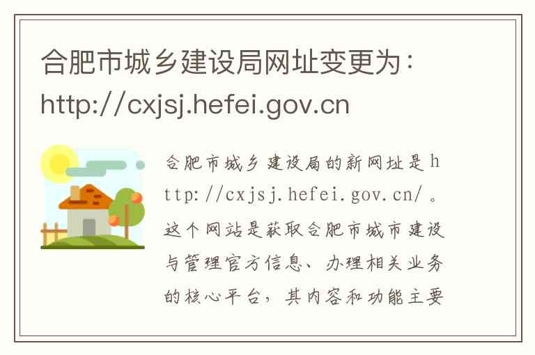 合肥市城乡建设局的新网址是 http://cxjsj.hefei.gov.cn/ 。这个网站是获取合肥市城市建设与管理官方信息、办理相关业务的核心平台,其内容和功能主要包含以下几个方面: