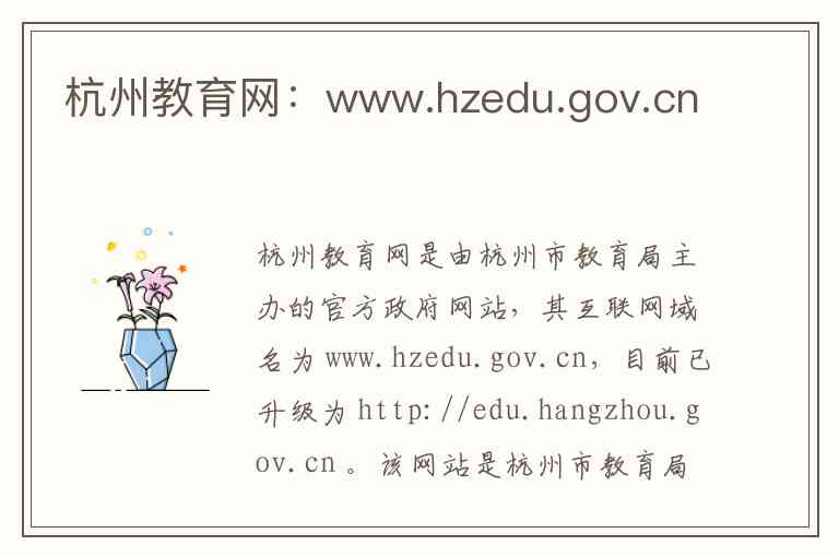 杭州教育网是由杭州市教育局主办的官方政府网站,其互联网域名为 www.hzedu.gov.cn,目前已升级为 http://edu.hangzhou.gov.cn 。该网站是杭州市教育局信息发布和提供在线服务的官方主阵地,也是向广大师生及社会各界展示杭州教育的重要窗口 。