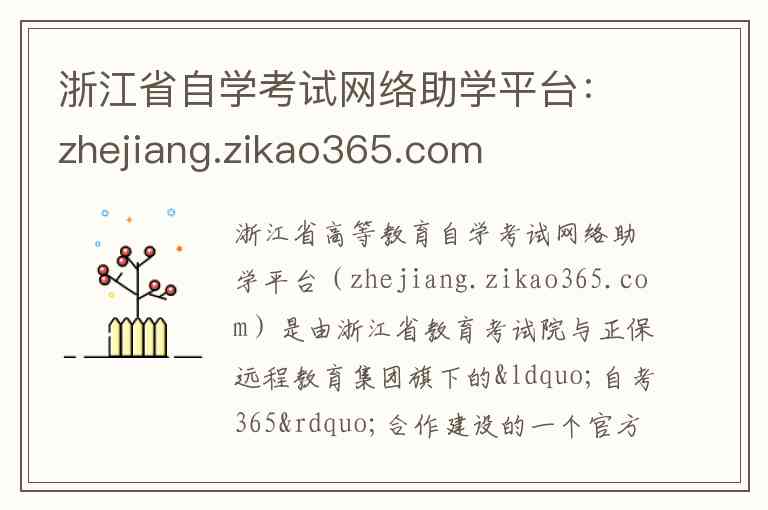 浙江省高等教育自学考试网络助学平台(zhejiang.zikao365.com)是由浙江省教育考试院与正保远程教育集团旗下的“自考365”合作建设的一个官方在线学习平台。该平台旨在通过网络技术为浙江省的自考生提供优质的教学资源,并开展课程学业综合评价体系(通常称为网络助学加分)工作。