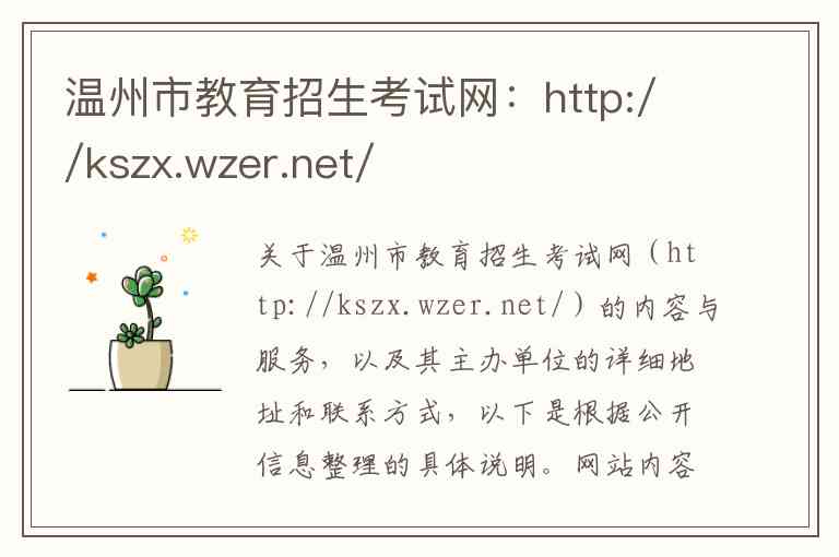 关于温州市教育招生考试网(http://kszx.wzer.net/)的内容与服务,以及其主办单位的详细地址和联系方式,以下是根据公开信息整理的具体说明。