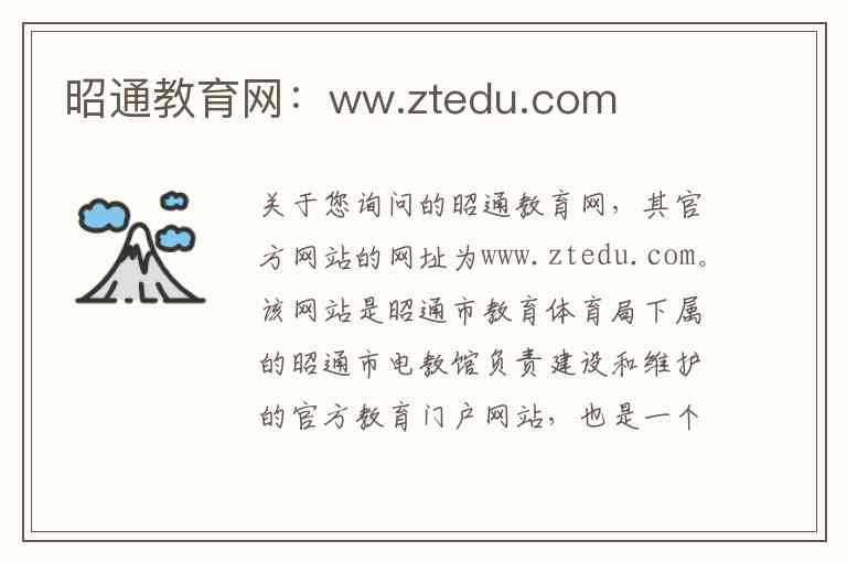 关于您询问的昭通教育网,其官方网站的网址为www.ztedu.com。该网站是昭通市教育体育局下属的昭通市电教馆负责建设和维护的官方教育门户网站,也是一个综合性的教育信息资源应用平台,自2004年起开始运行。