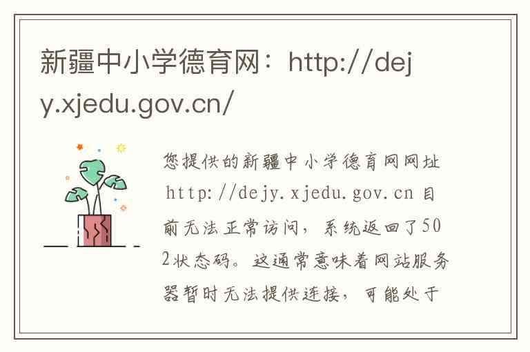 您提供的新疆中小学德育网网址 http://dejy.xjedu.gov.cn 目前无法正常访问,系统返回了502状态码。这通常意味着网站服务器暂时无法提供连接,可能处于维护、关闭或网络故障状态。因此,我无法直接从该网站获取其具体的内容、服务、详细地址和联系方式。
