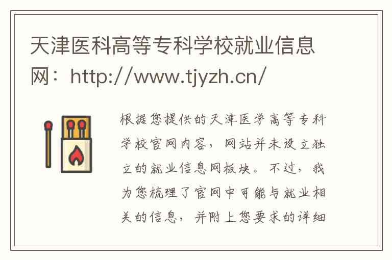根据您提供的天津医学高等专科学校官网内容,网站并未设立独立的就业信息网板块。不过,我为您梳理了官网中可能与就业相关的信息,并附上您要求的详细联系方式和地址。