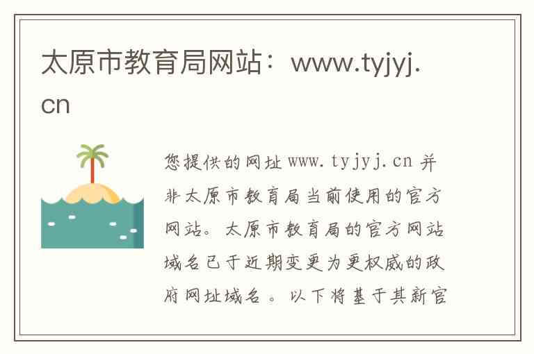 您提供的网址 www.tyjyj.cn 并非太原市教育局当前使用的官方网站。太原市教育局的官方网站域名已于近期变更为更权威的政府网址域名 。以下将基于其新官方网站及其他官方信息,为您详细介绍太原市教育局官网的内容与服务,并提供准确的地址和联系方式。