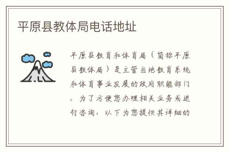 平原县教育和体育局(简称平原县教体局)是主管当地教育系统和体育事业发展的政府职能部门。为了方便您办理相关业务或进行咨询,以下为您提供其详细的官方联系渠道、办公地址以及该机构的主要职责和服务内容说明。