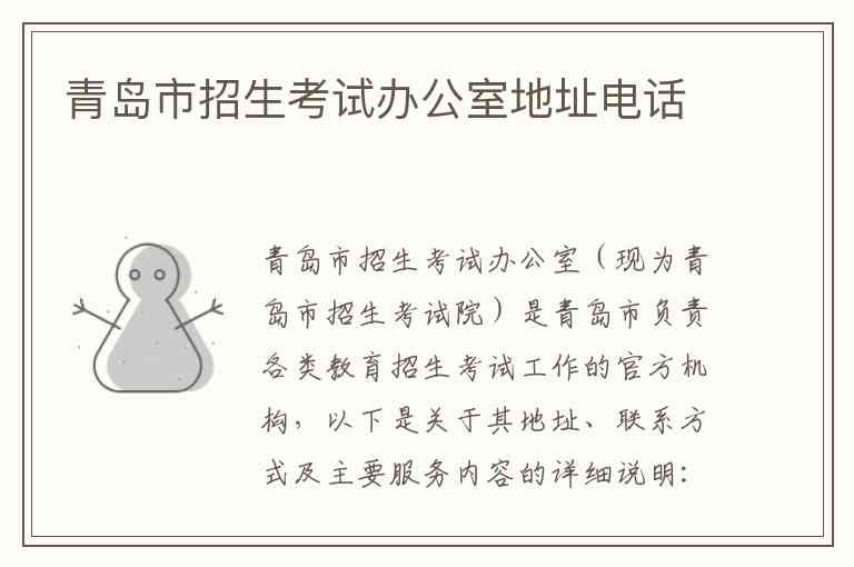 青岛市招生考试办公室(现为青岛市招生考试院)是青岛市负责各类教育招生考试工作的官方机构,以下是关于其地址、联系方式及主要服务内容的详细说明: